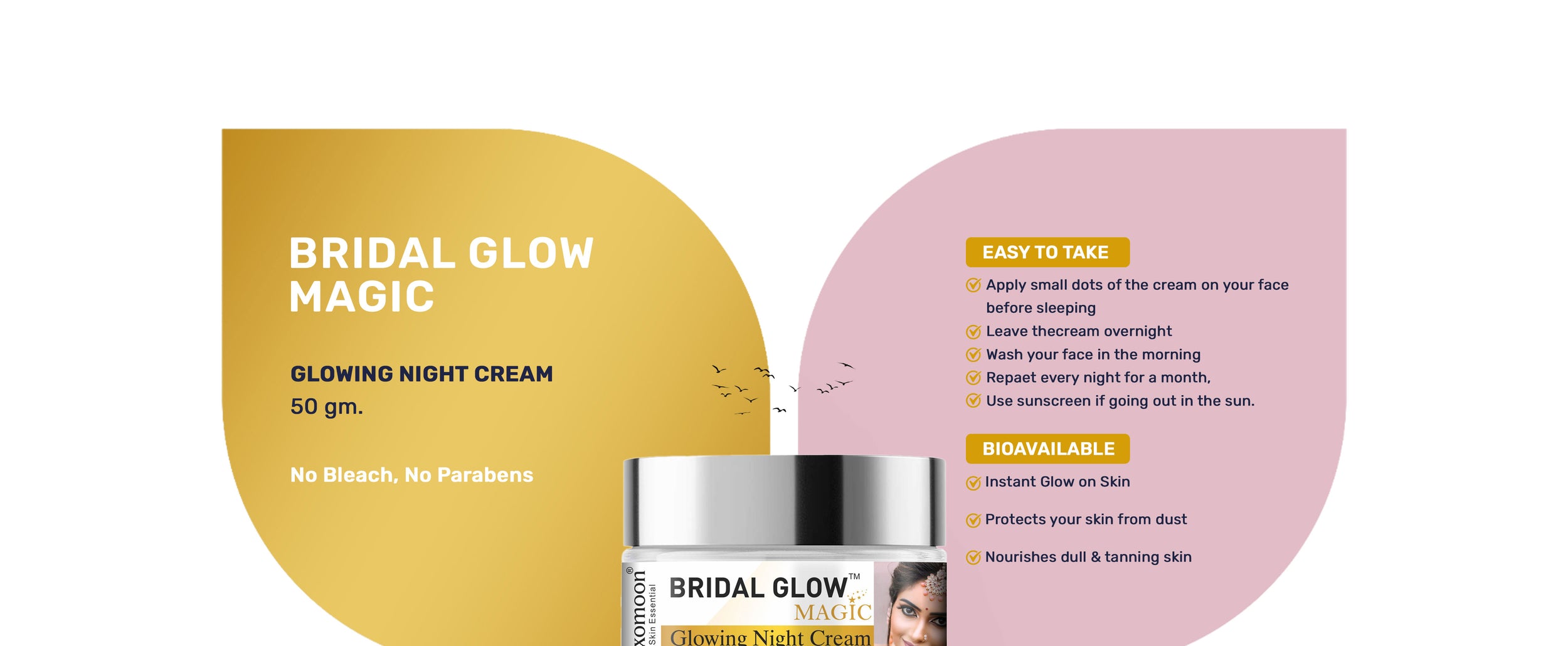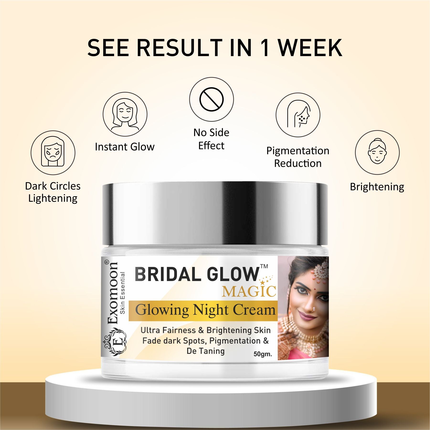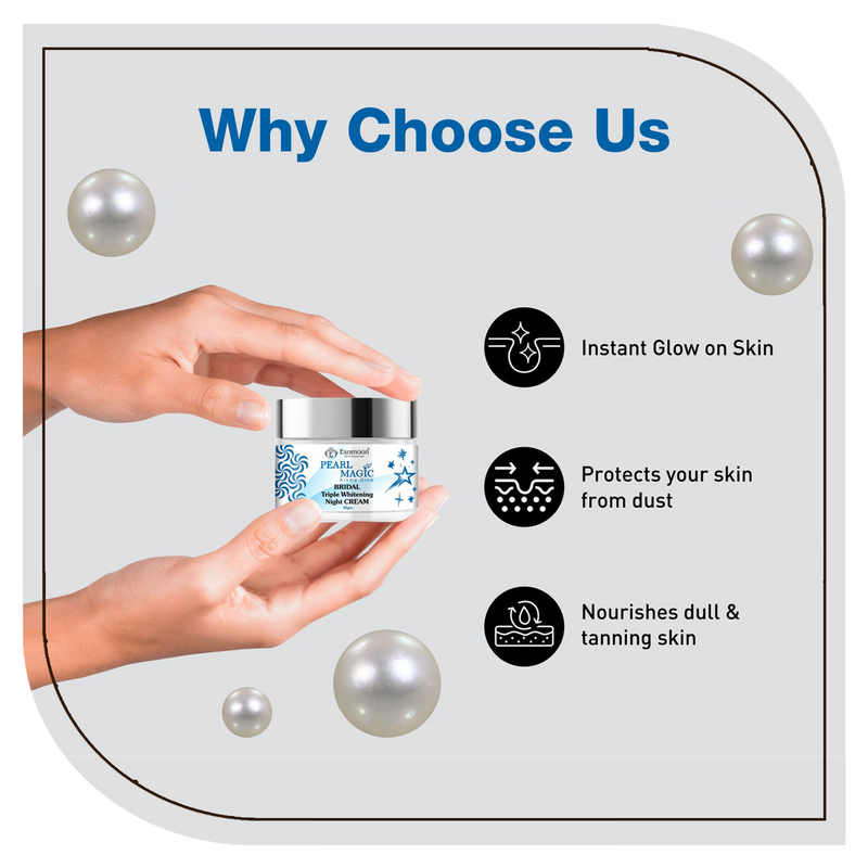 Exomoon Bridal Glow Magic is a lightweight, non-greasy night cream packed with Vitamin C, Hyaluronic Acid, Saffron Oil, Green Tea, and 7 powerful skin actives. It helps brighten skin tone, reduce dark spots and pigmentation, hydrate deeply, calm redness, and give a fresh, radiant glow by morning. No parabens, no bleach – just clean botanical power for visibly glowing skin.