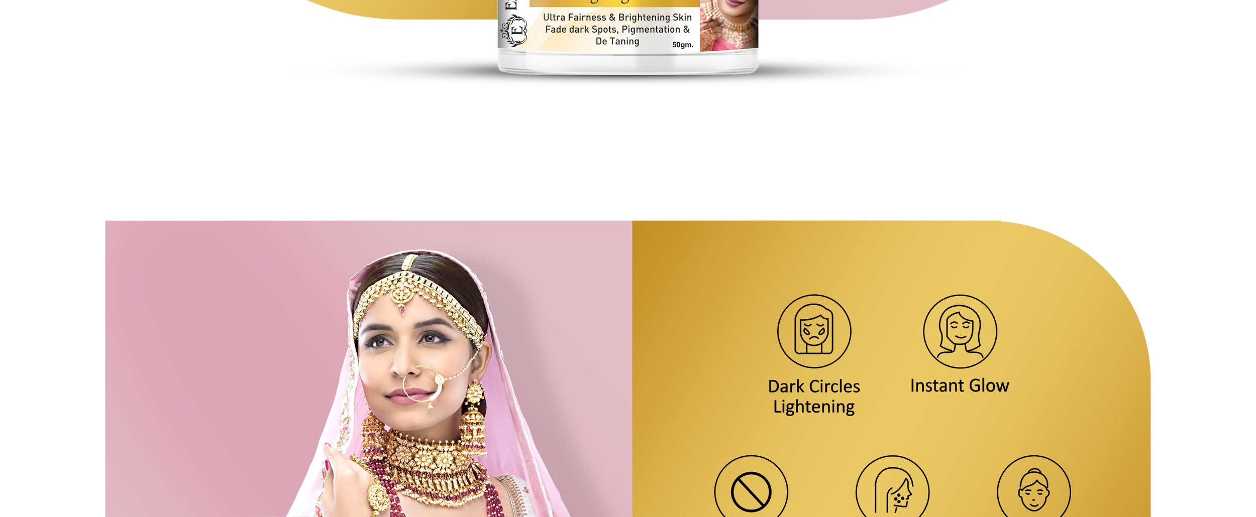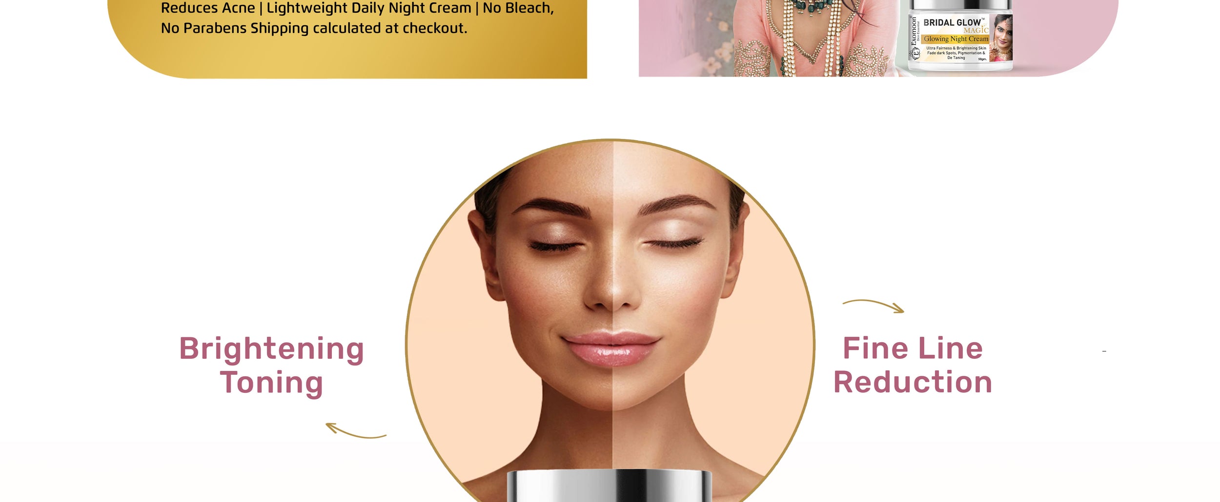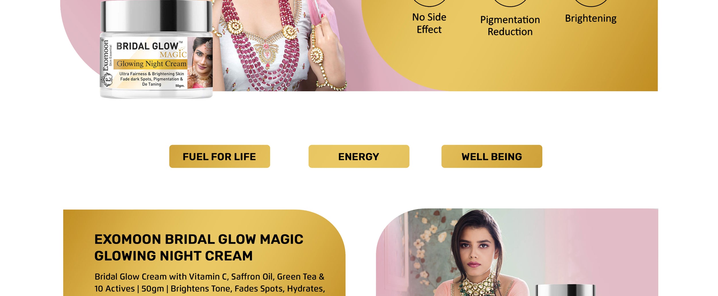Exomoon Bridal Glow Magic is a lightweight, non-greasy night cream packed with Vitamin C, Hyaluronic Acid, Saffron Oil, Green Tea, and 7 powerful skin actives. It helps brighten skin tone, reduce dark spots and pigmentation, hydrate deeply, calm redness, and give a fresh, radiant glow by morning. No parabens, no bleach – just clean botanical power for visibly glowing skin.